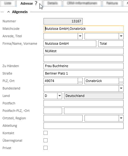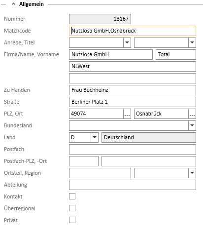 Innerhalb eines Registers sind die Inhalte durch Bereiche (Groupboxen) weiter inhaltlich gruppiert. Ein Bereich (GroupBox) besteht aus mehreren Detailzeilen die eine Bezeichnung und unterschiedliche Eingabeelemente enthalten.