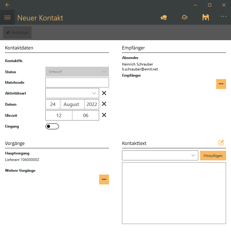 Wenn eine Aktivitätsart mit der Option E-Mail ausgewählt wurde, ist die Absenderauswahl nicht sichtbar, da nur ein Absender möglich ist und dies immer der aktuell angemeldete Mitarbeiter ist.