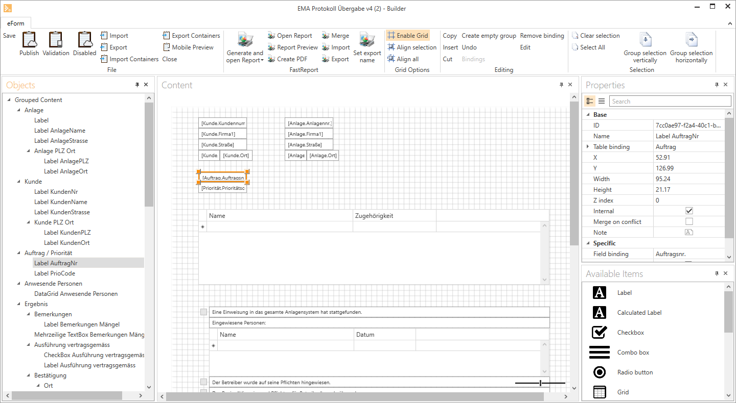 The menu bar contains various functions, such as Save or Preview, and you can also open the FastReport that is linked to the eForm.