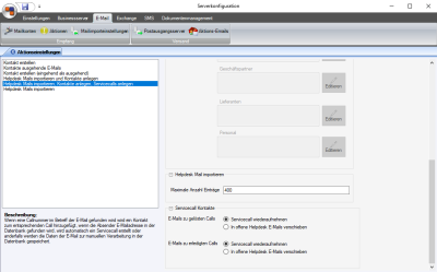 Here you can define whether existing but closed service calls (Solved status) are automatically reopened when a corresponding email is received or whether these emails are saved first in the database for manual processing (Helpdesk | Open Helpdesk emails).