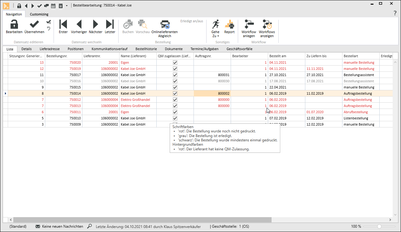 Die in der Liste markierte Bestellung kann auf den weiteren Registern weiterbearbeitet werden.