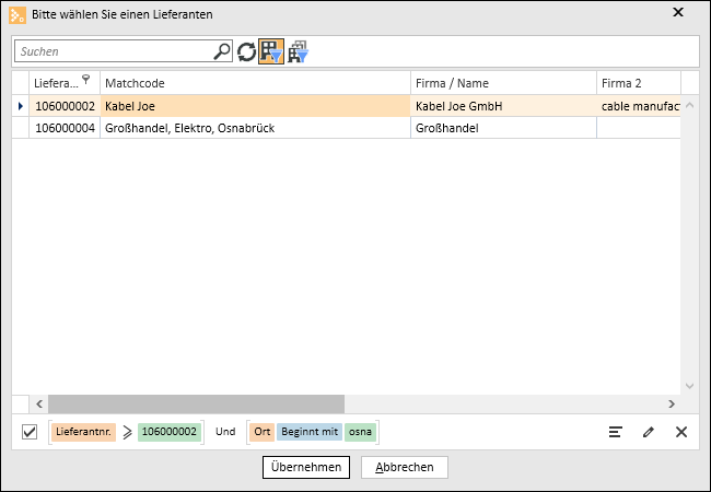 Sie können Sie Lieferantenliste über die Such- und Filterfunktionen einschränken.