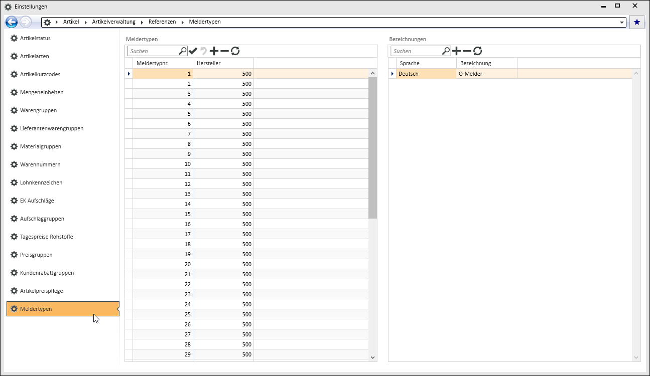 In der linken Liste legen Sie den Meldertyp mit der Lieferantenzuordnung fest, in der rechten Liste können Sie zu jedem Meldertyp eine Bezeichnung in verschiedenen Sprachen hinterlegen.