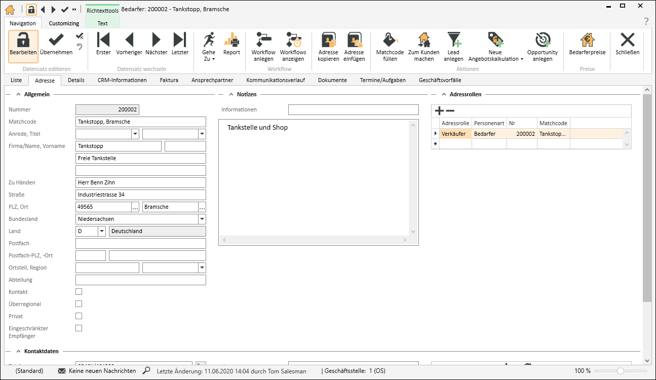 Mit Adressrollen ist es möglich einem Vorgang eine beliebige Art von Adressen zuzuordnen, die Zuordnung kann durch die Personenart und die Vorgangsart weiter eingeschränkt werden.