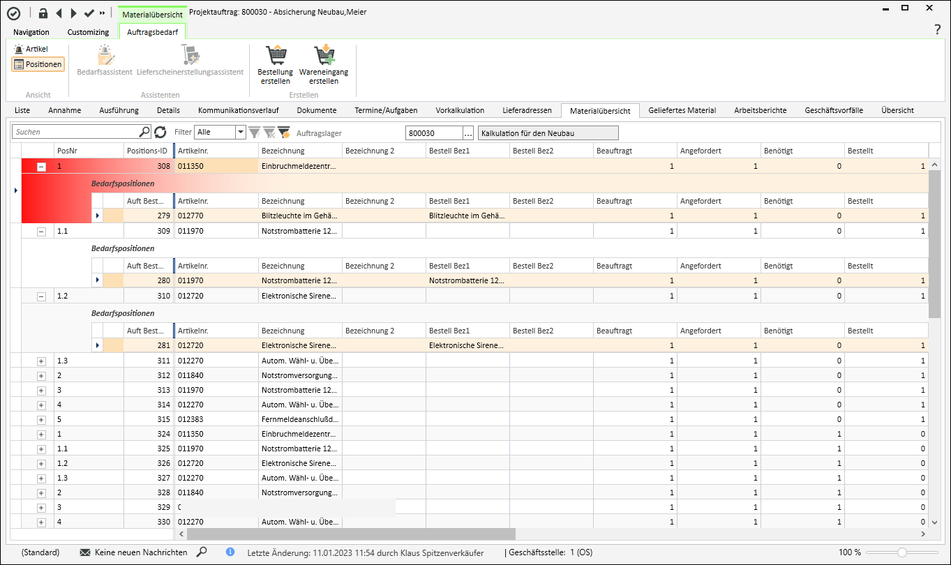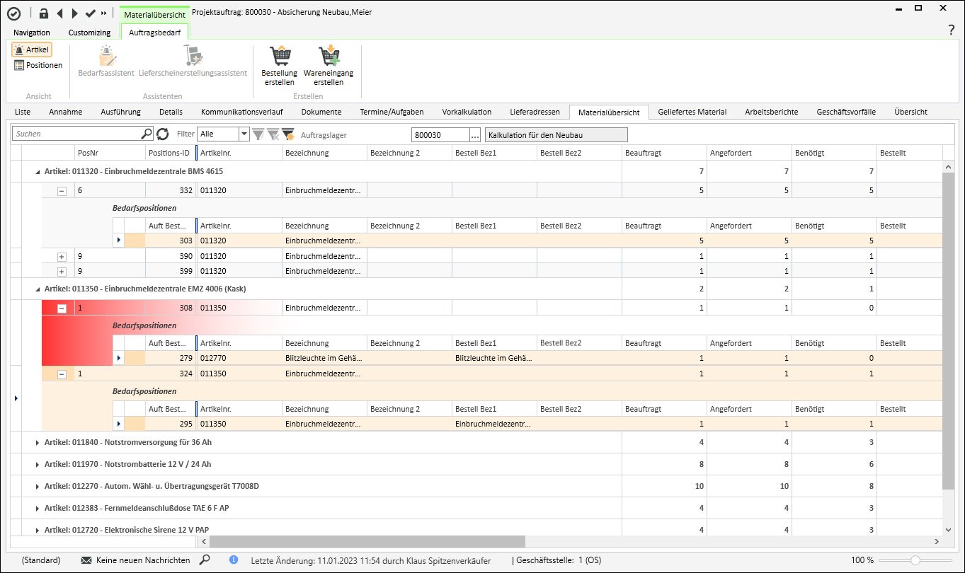 Bei Änderungen der Auftragspositionen wird im Hintergrund automatisch der Artikelbedarf angepasst.