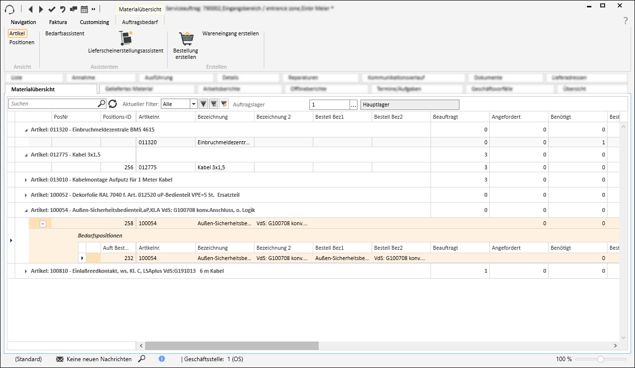 Bei den Service- und Wartungsaufträgen erfolgt die Erfassung der Auftragspositionen über das Register Materialbedarf.