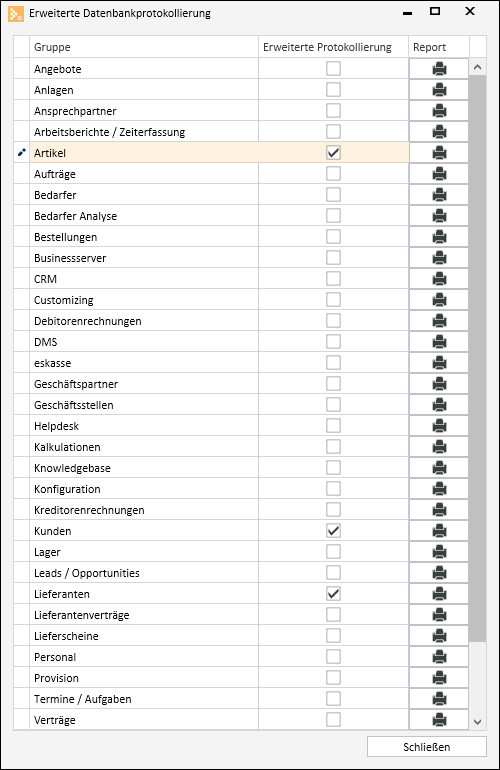 Über Werkzeuge | Datenbankprotokollierung können Programmbereiche aktiviert werden, bei denen eine detaillierte Änderungshistorie protokolliert werden soll (Revisionslogik).