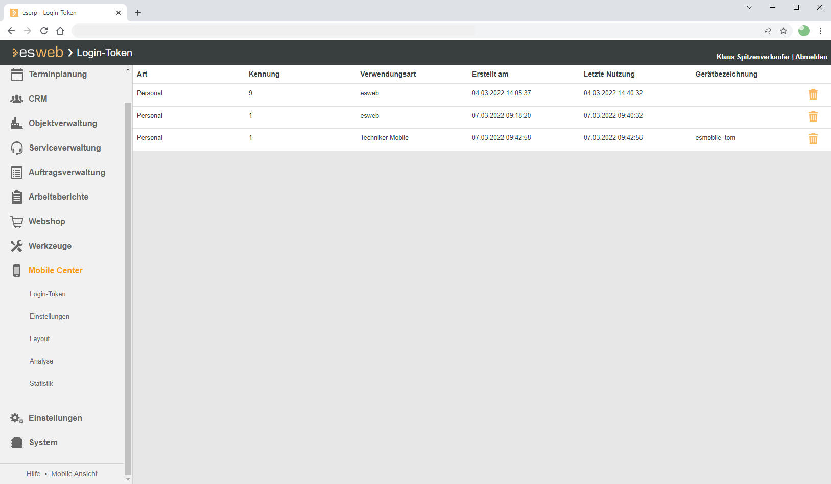 Auf den Register Mobile Center | Login Token können die Anmeldeschlüssel für mobile Geräte / Benutzer verwaltet werden.