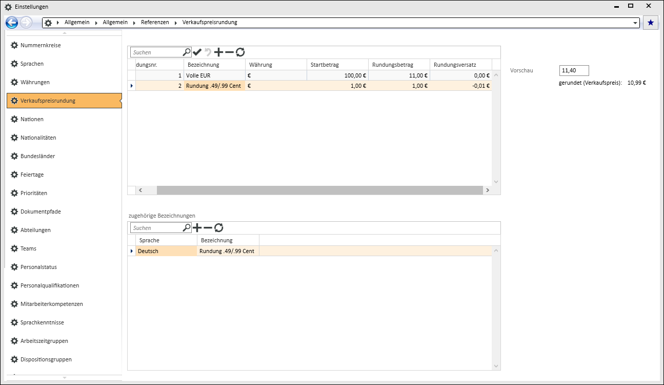 Unter zugehörige Bezeichnungen können Sie eine sprechende Beschreibung für die Rundungsregel in diversen Sprachen hinterlegen.