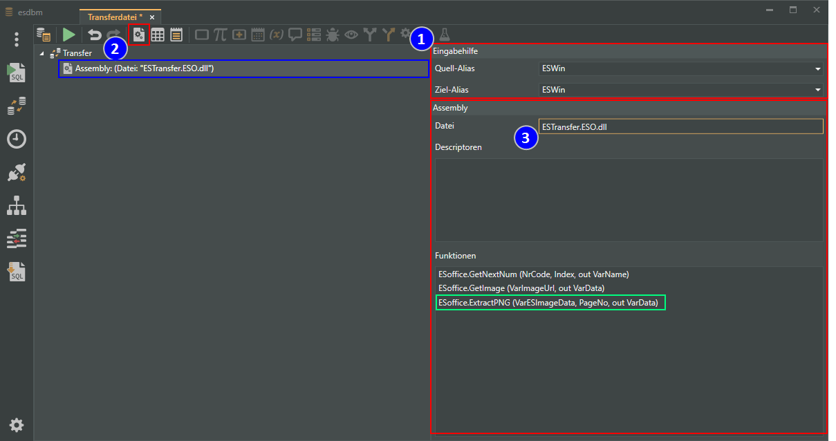 Tragen Sie im Bereich Assembly im Feld Datei ESTransfer.ESO.dll ein (3).