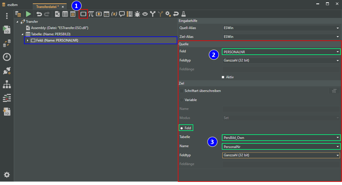 Im Bereich Ziel aktivieren Sie die Option Feld und wählen anschließend die Tabelle Persbild_own und unter Name das Feld PersonalNr aus (3).