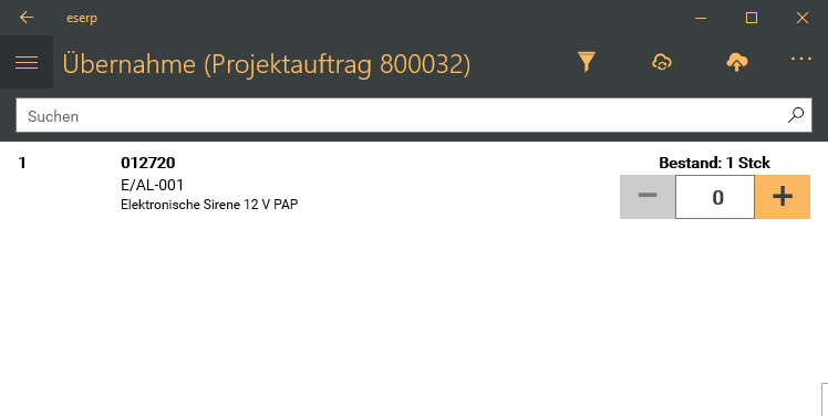 Tragen Sie im Eingabefeld die Menge ein, die Sie aus der gelieferten Position in den Arbeitsbericht übernehmen möchten. Mit den Schaltflächen + / - kann die Anzahl jeweils um ein Stück erhöht / verringert werden.