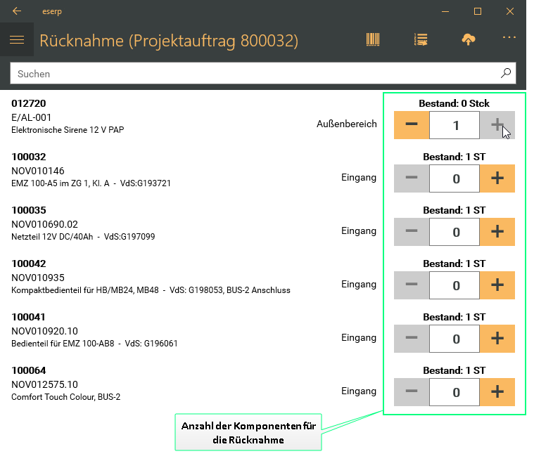 Es werden alle Komponenten der zugeordneten Anlage für die Rücknahme mit der entsprechenden vorhandenen Stückzahl angezeigt. Tragen Sie im rechten Eingabefeld die Stückzahl für die Rücknahme der jeweiligen Komponente ein. Die vorhandene Stückzahl wird jeweils um die Anzahl der eingegebenen Rücknahmen reduziert.