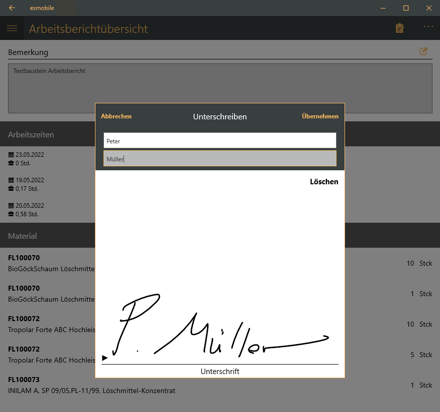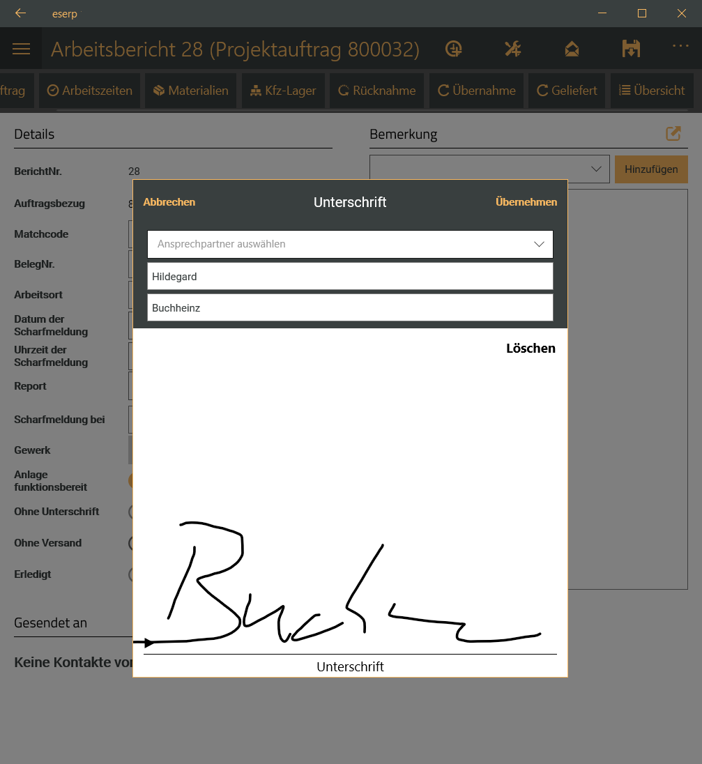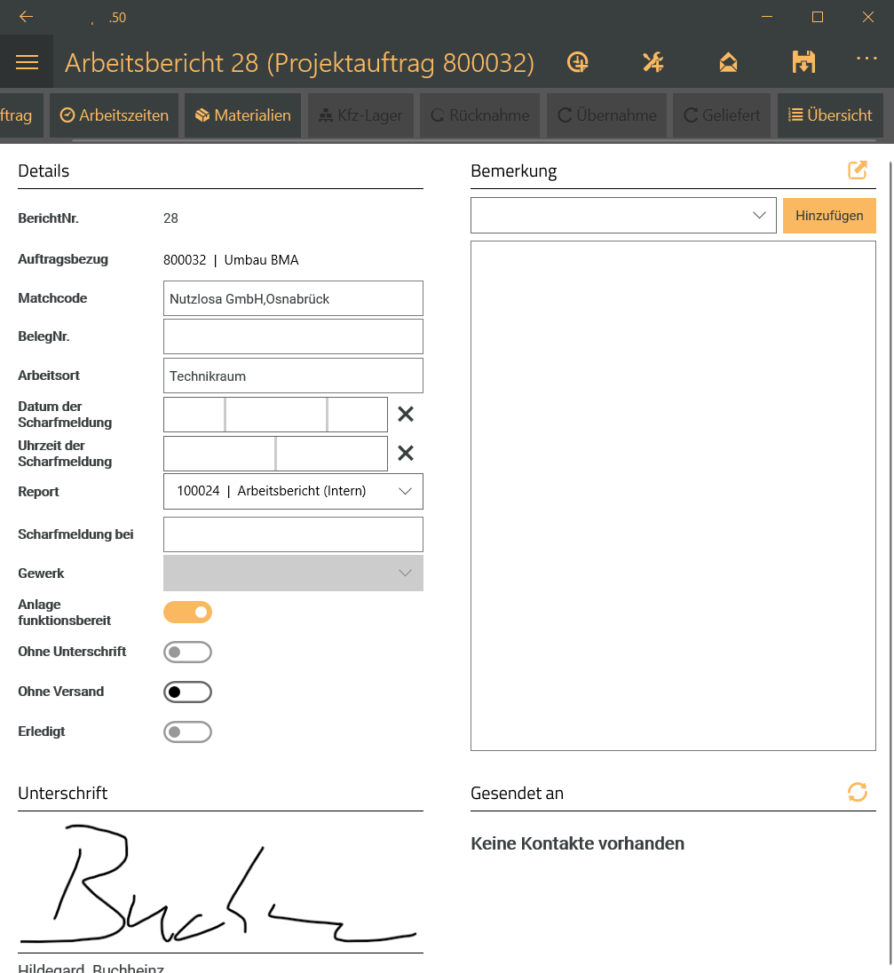 Nach der Unterschrift ist der Arbeitsbericht abgeschlossen und es sind keine Änderungen an den Arbeitszeiten und Materialbuchungen mehr möglich.