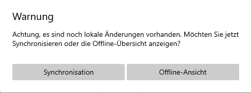 Sind beim Aufruf des Registers noch lokale Daten vorhanden, die noch nicht mit Server synchronisiert worden sind, wird eine Warnmeldung angezeigt.