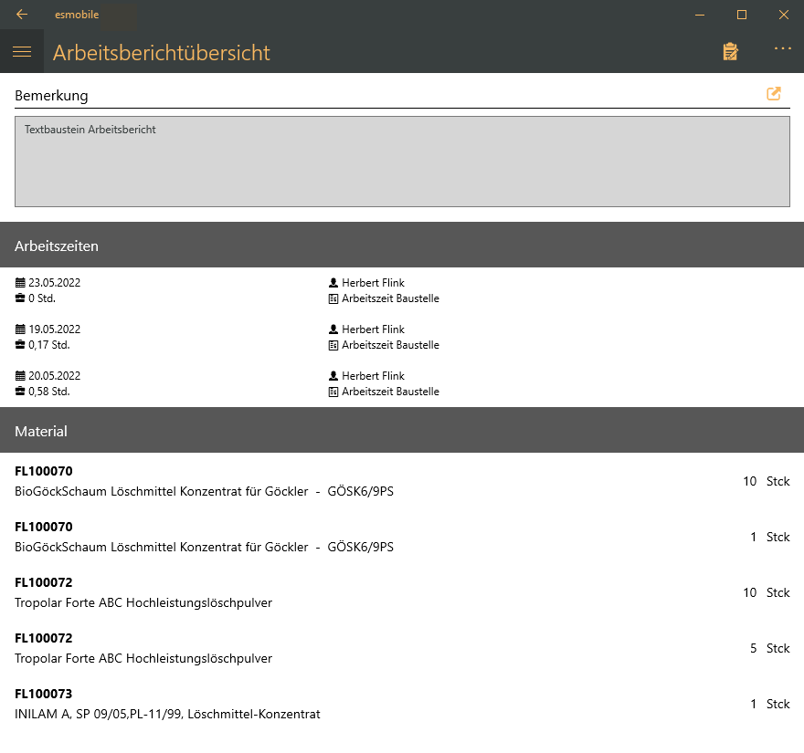 Besteht keine Onlineverbindung zum Server oder ist der AutoSync deaktiviert, können Sie sich eine Offline-Ansicht des Arbeitsberichtes anzeigen lassen. Die Offline-Ansicht enthält die Arbeitszeiten und Materialien zum Arbeitsbericht, sie entspricht aber nicht der Druckversion des Arbeitsberichtes.