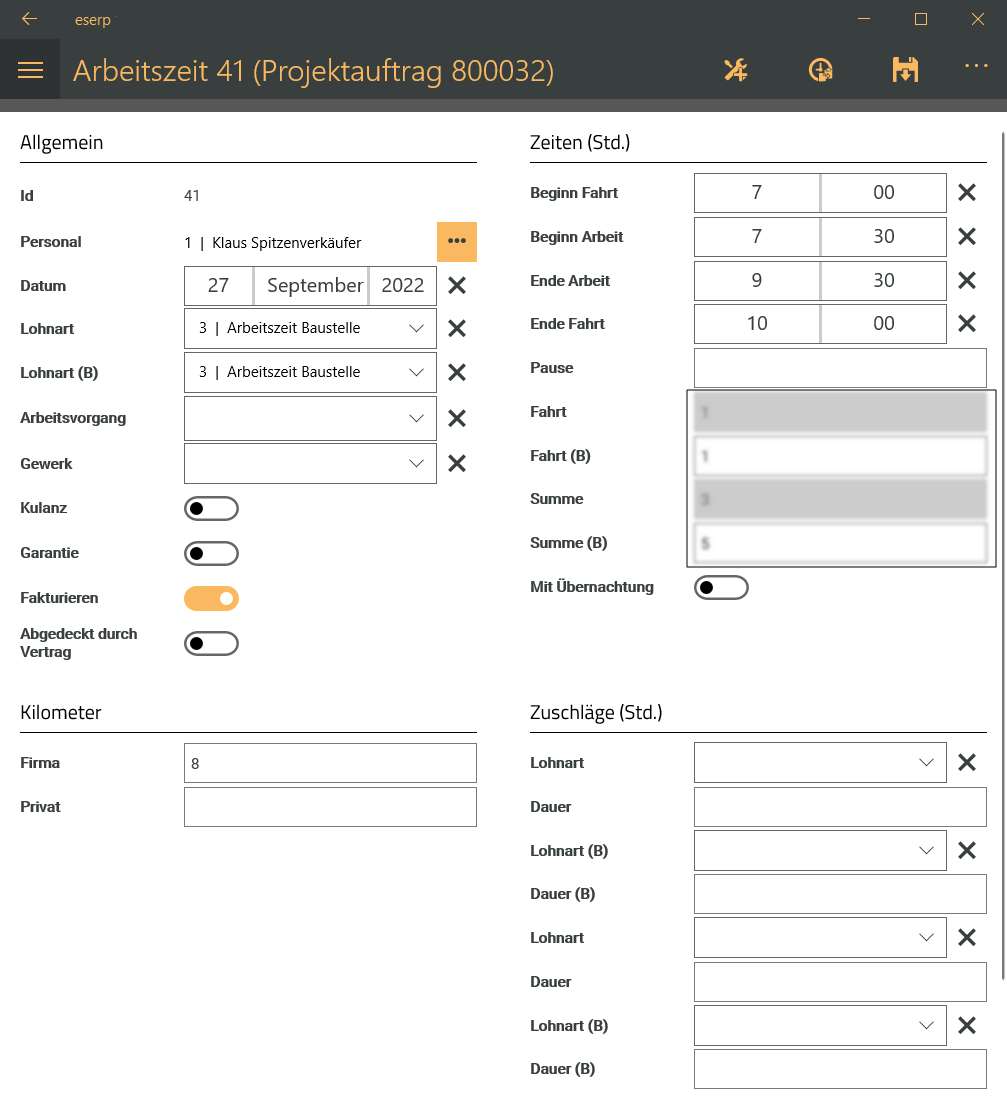 Kontrollieren Sie die Arbeitszeiten (Register Arbeitszeiten) und das installierte Material (Register Materialien).