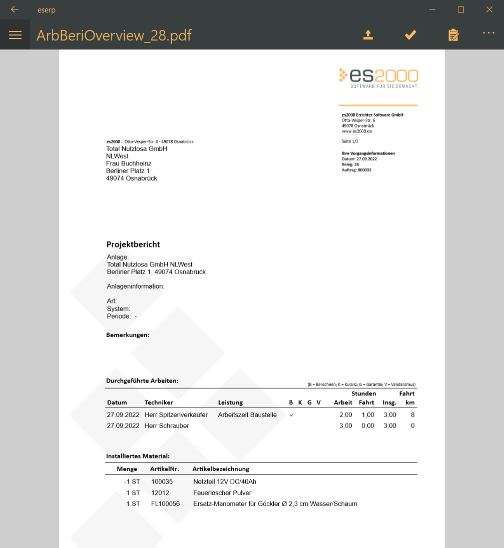 Übersicht.Die Vorschau des Arbeitsberichtes wird geöffnet, diese kann mit dem Kunden vor der Unterschrift besprochen werden.