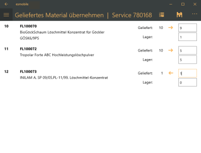 Pfeil rechts Schaltfläche können Sie die gesamte gelieferte Menge für die Übernahme eintragen, die Menge Geliefert wird entsprechend reduziert.