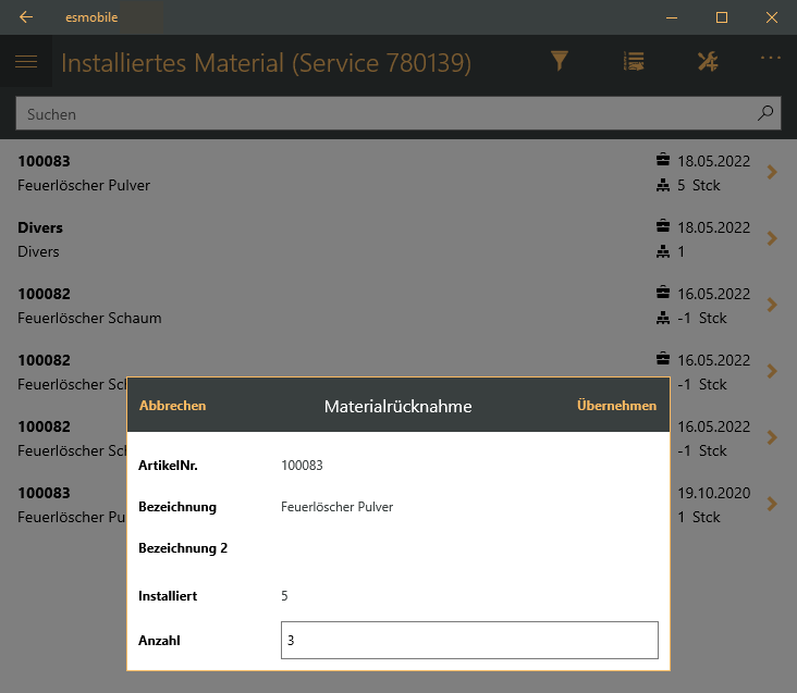 Das Feld Anzahl ist mit der installierten Menge (Installiert) vorbelegt. Für eine Teilrücknahme kann die Anzahl noch angepasst werden.