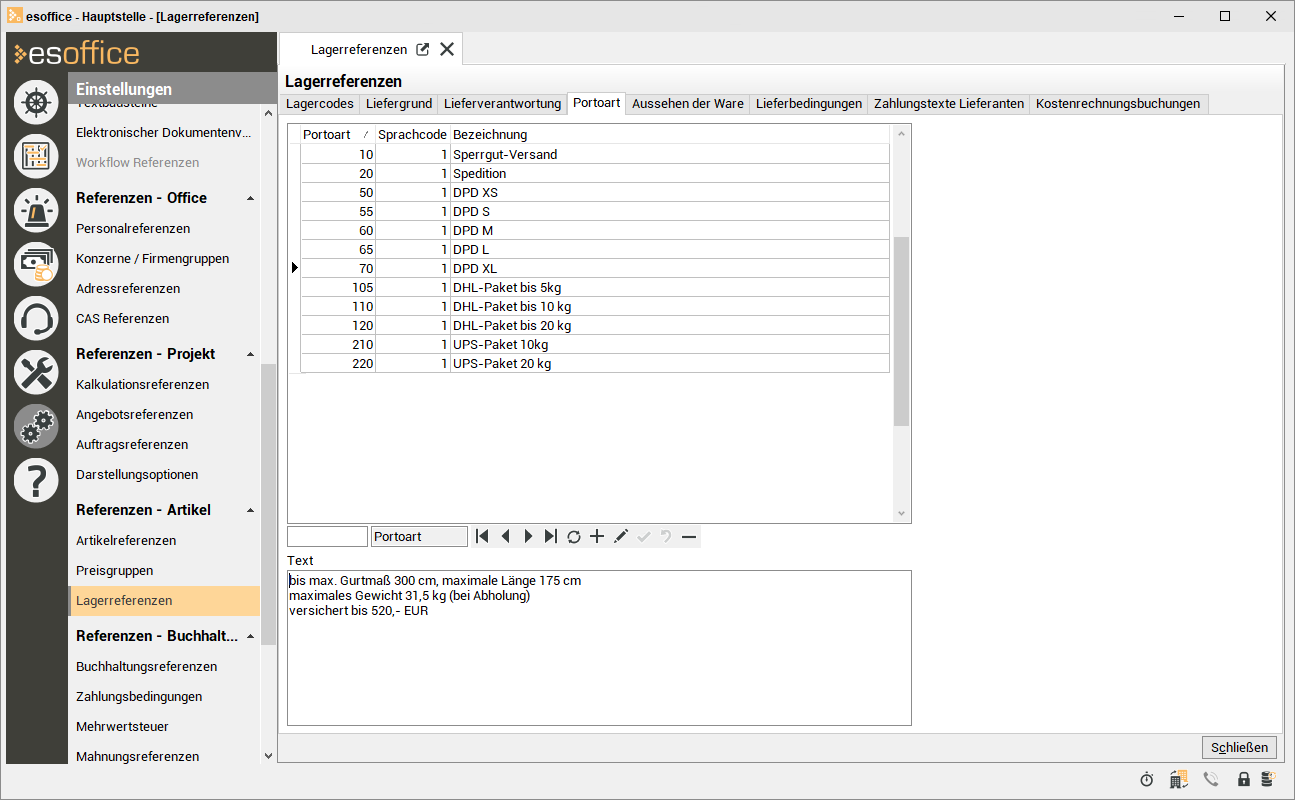 Die hier zu hinterlegenden Portoarten dienen dazu, um die Portoarten für einen Lieferschein festzulegen.
