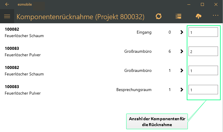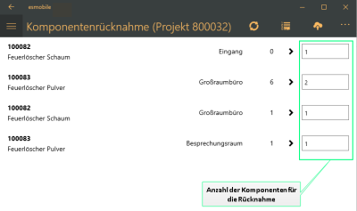 Haben Sie die jeweilige Anzahl für die Rücknahme bei den Komponenten eingetragen, tippen / klicken Sie auf die Schaltfläche