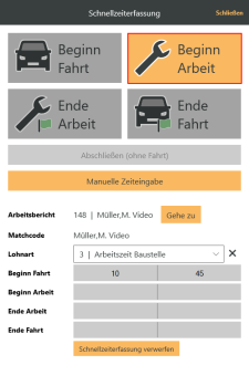 Mit der Schnellzeiterfassung ist die unkomplizierte Dokumentation von Fahrt- und Arbeitszeiten für einen Auftrag möglich.