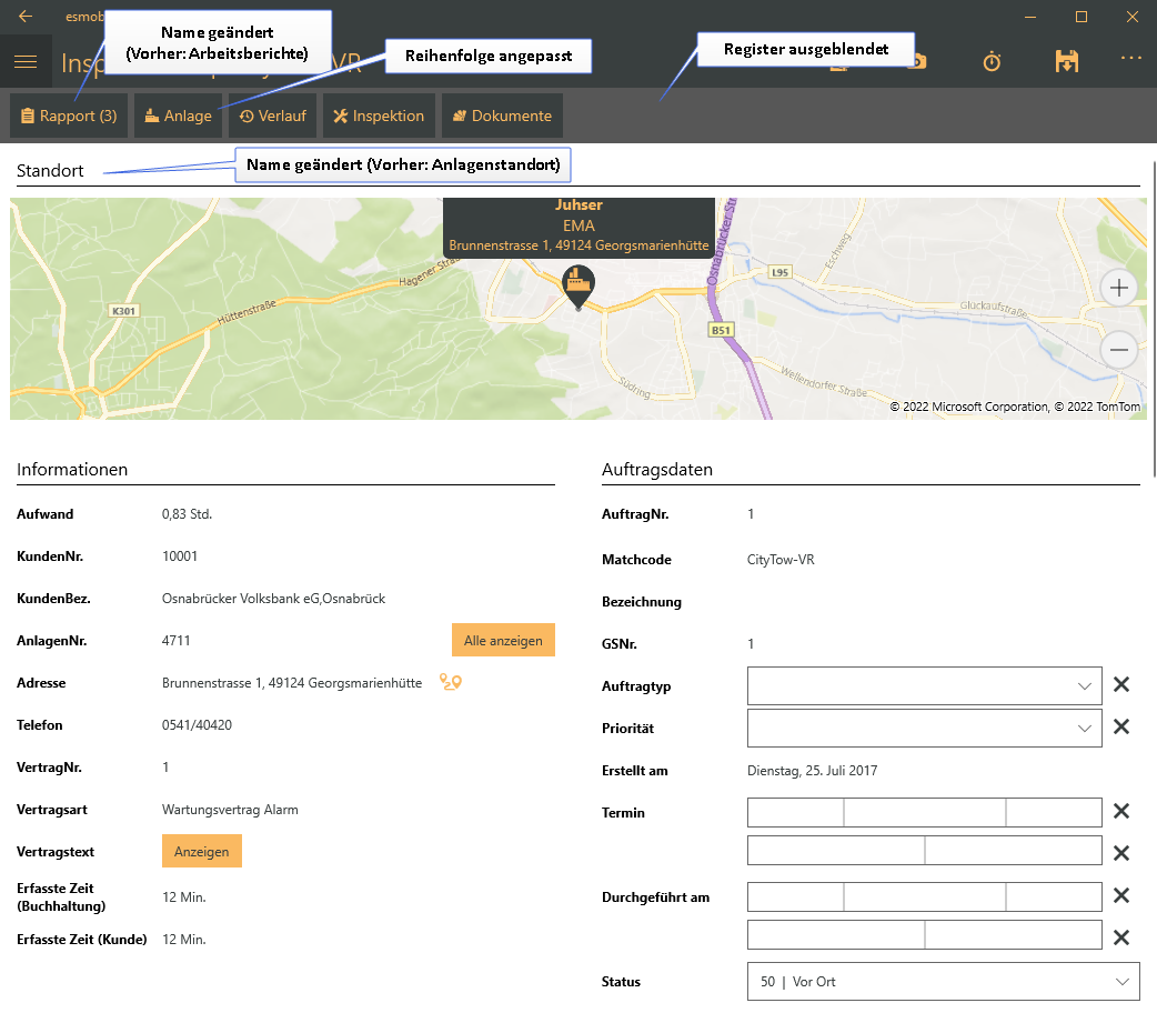 Angepasstes Layout Auftrag (Inspektionsauftrag) in der esmobile UWP-App (Windows)