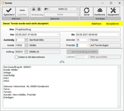Beim Löschen oder Verschieben von Terminen, die mit einem Serviceauftrag verbunden sind, wird der zuständige Techniker in dem Auftrag aktualisiert.