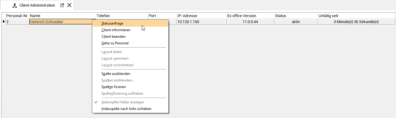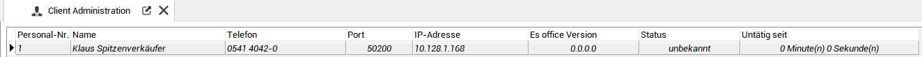 Sollte sich ein weiter Mitarbeiter im esoffice anmelden, während die Client Administration schon gestartet ist, so wird dieser Mitarbeiter erst einmal kursiv und mit dem Status unbekannt in der Liste dargestellt.