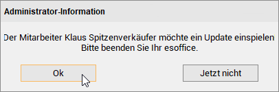 Mit der Schaltfläche Jetzt nicht kann diese Meldung geschlossen werden und es können zum Beispiel noch neue Daten gesichert werden, bevor der Mitarbeiter sein esoffice selbst beendet.