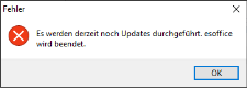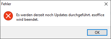 Sollte sich ein Mitarbeiter versuchen anzumelden, während ein Update eingeleitet ist, erscheint nachfolgende Meldung und esoffice wird beendet.