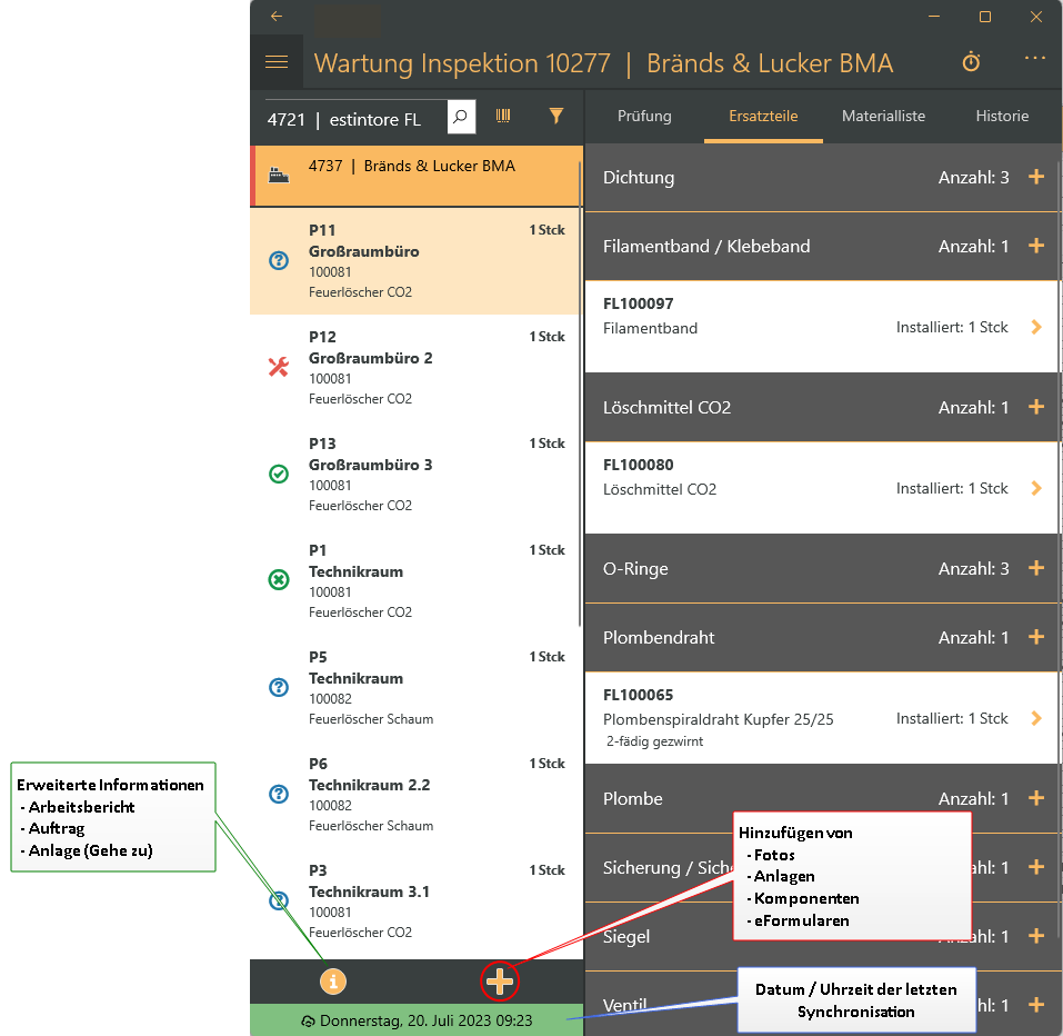 Durch Antippen / Anklicken einer Komponente wird diese ausgewählt, je nach gewähltem Register (Beauftragt, Ersatzteile, Prüfung, Historie) auf der rechten Seite werden Daten angezeigt oder es können Aktionen durchgeführt werden.