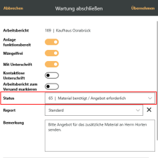 Der Auftragsstatus für Material benötigt kennzeichnet Service- und Inspektionsaufträge auch als Technisch Erledigt.