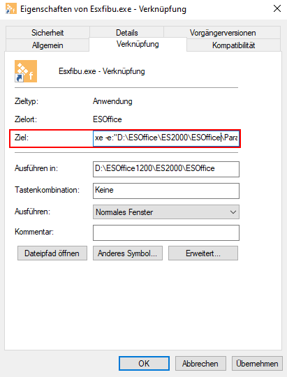 Möchte Sie die esXFibu-Schnittstelle mit Parametern starten, legen Sie dazu eine Verknüpfung der esXFibu.exe an. Die Datei befindet sich im esoffice Programmverzeichnis.
