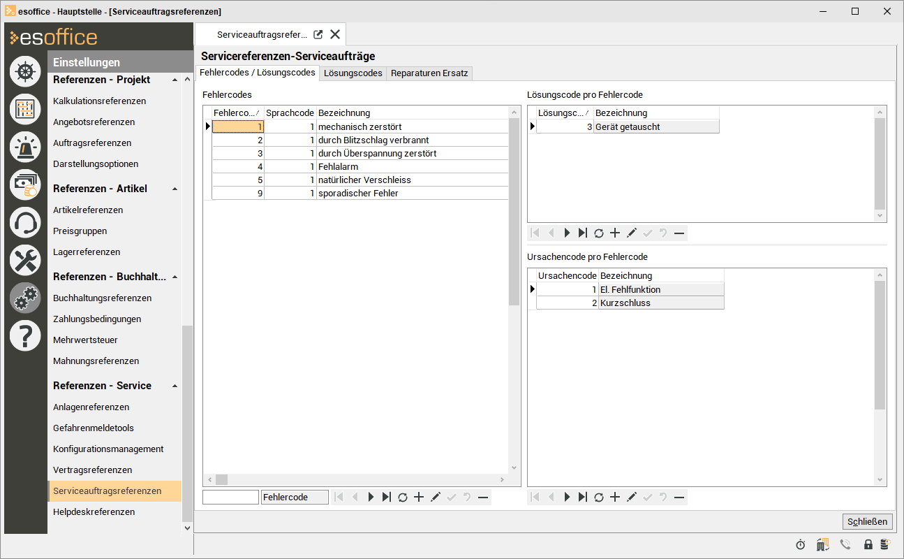 Lösungscodes werden unter Einstellungen | Referenzen – Service | Serviceauftragsreferenzen | Lösungscodes angelegt und verwaltet.