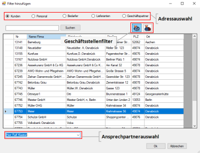 Ist dieses Feld leer, so wird die ausgewählte Adresse in den Filter eingetragen. Steht ein Ansprechpartner in dem Feld, so wird dieser übernommen.