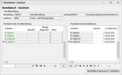 Die Liste auf der rechten Seite Positionen des Bestellabrufs ist dann die Grundlage für den zu erstellenden Bestellabruf.