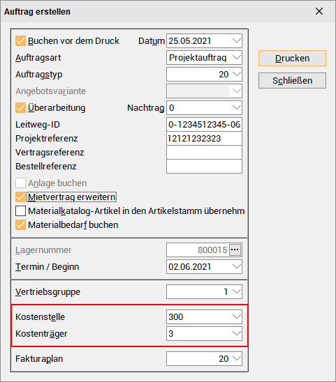 Ist unter Einstellungen | Allgemein | Auftrag die Option Kostenträger beim Buchen angeben aktiviert, können Sie einen Kostenträger für den Auftrag auswählen.