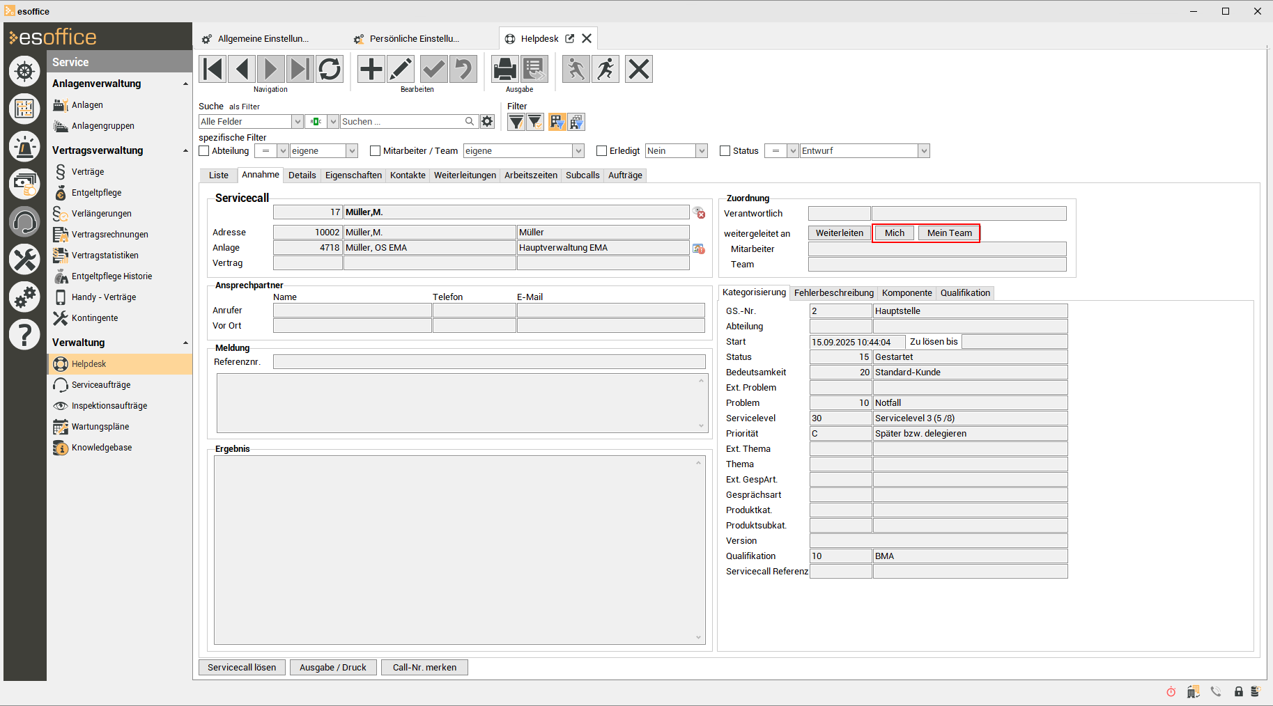 Im Helpdesk gibt es neben den Schaltflächen Weiterleiten die Schaltflächen Mich und Mein Team für schnelle Servicecall Weiterleitungen.