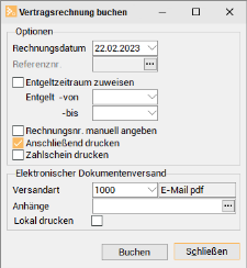 Sie können Vertragsrechnungen / Vertragsgutschriften erst buchen und erst nachträglich drucken. Dies spart Zeit, wenn eine größere Anzahl Rechnungen / Gutschriften gedruckt werden soll. Außerdem wird das Programm nur kurzzeitig blockiert).