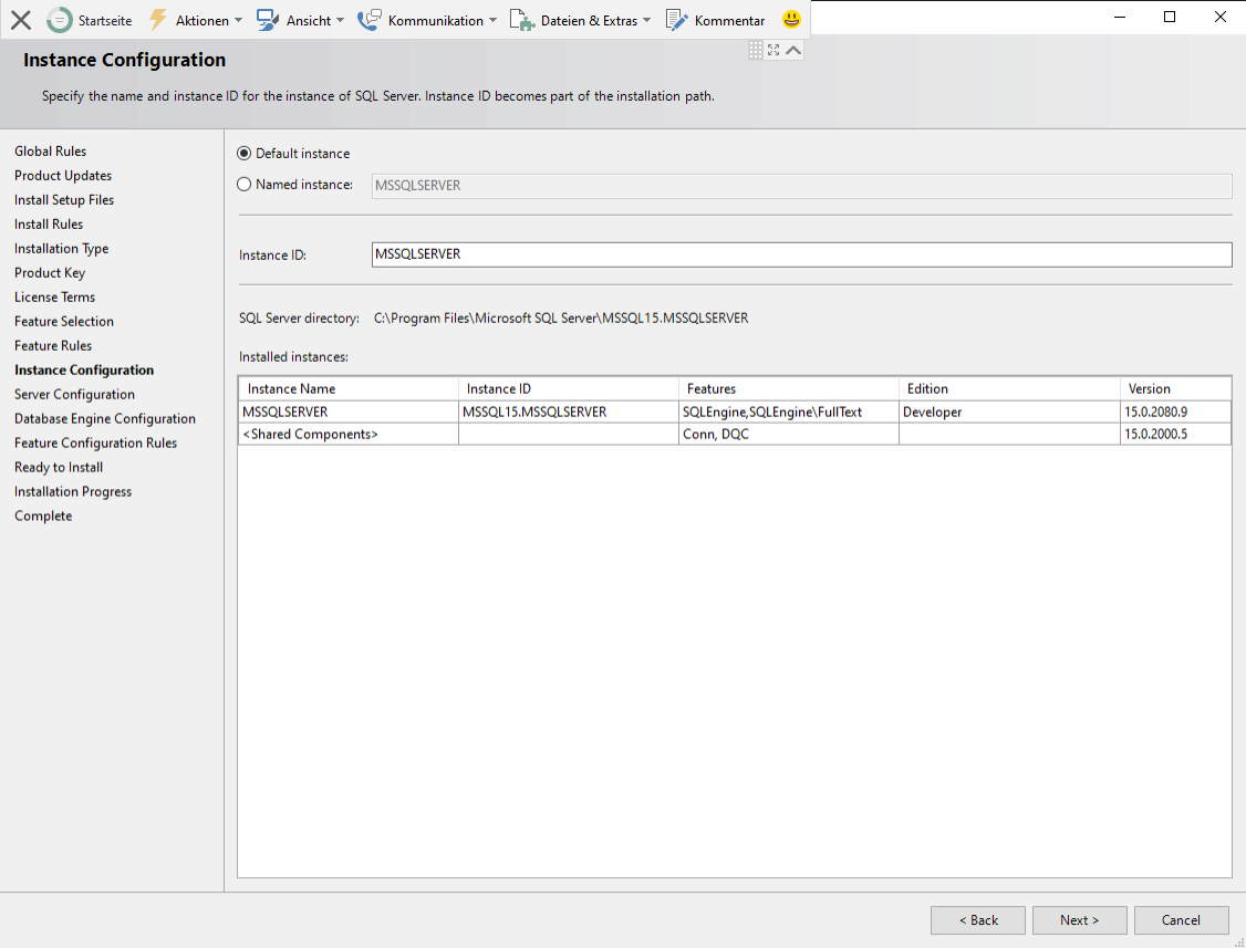 Im diesem Beispiel wird die Standardinstanz verwendet, grundsätzlich ist auch eine individuell benannte Instanz möglich.