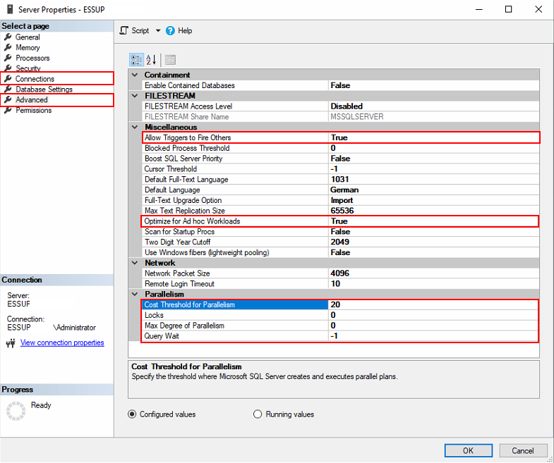 Diese Einstellungen sind über das Microsoft SQL Server Management Studio (SSMS) erreichbar.