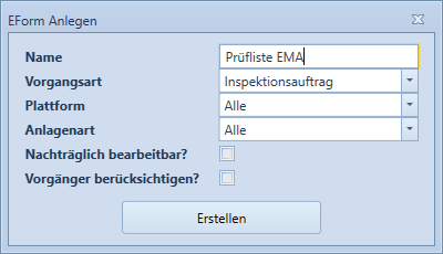 Im Dialog EForm Anlegen werden die grundsätzlichen Vorgaben für das neue eFormular hinterlegt.