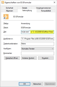 Maßnahme: Fügen Sie den Startparameter -e: mit dem Pfad zum PARA-Ordner der Programmverknüpfung hinzu.