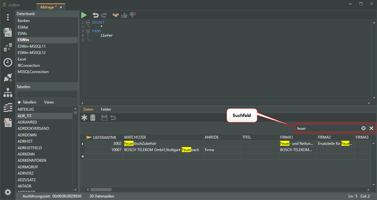 Als Vorgabe wird unter Datenbanken der Alias ESWin ausgewählt und die entsprechenden Datenbank-Tabellen aufgelistet.