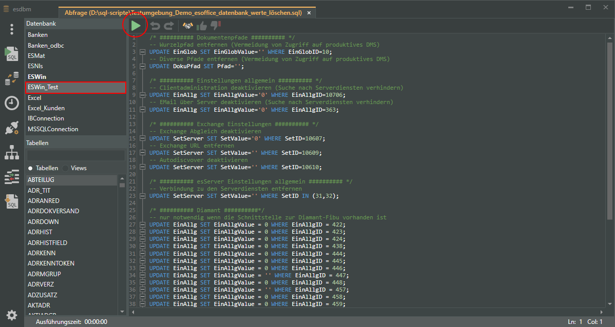 Sie können vor der Ausführung noch Anpassungen an Skript vornehmen, dafür sind umfangreiche Kenntnisse der esoffice Datenbanken und SQL-Wissen erforderlich.