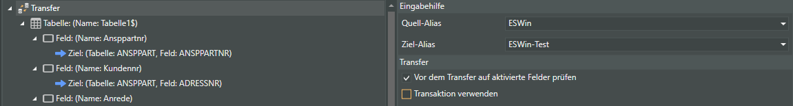 Haben Sie beim Transfer-Hauptknoten die Option Vor dem Transfer auf aktivierte Felder prüfen aktiviert, wird nach dem Start des Transfers eine Liste mit Feldern aus der Transferdatei angezeigt.