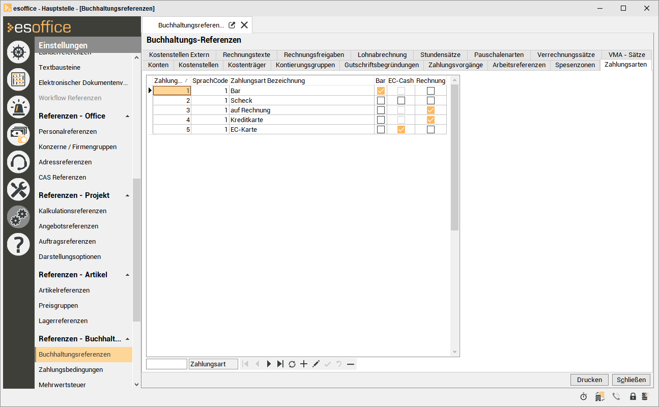 Legen Sie unter Einstellungen | Referenzen - Buchhaltung | Buchhaltungsreferenzen - Zahlungsarten die benötigten Zahlungsarten für die Kasse an.