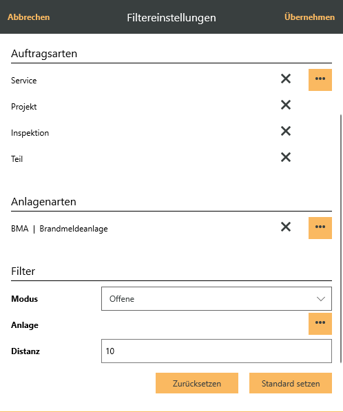Wählen Sie aus den zur Verfügung stehenden Anlagenarten die Anlagenarten aus, die im Filterergebnis enthalten sein sollen. Im Filterergebnis werden nur Aufträge angezeigt, denen eine Anlage mit eine der gewählten Anlagenarten zugeordnet ist.
